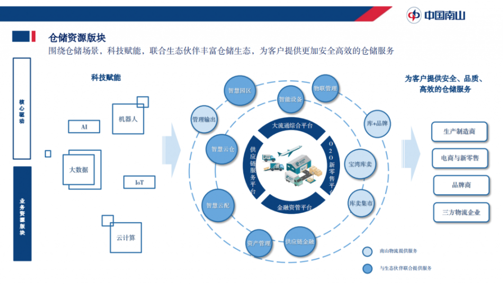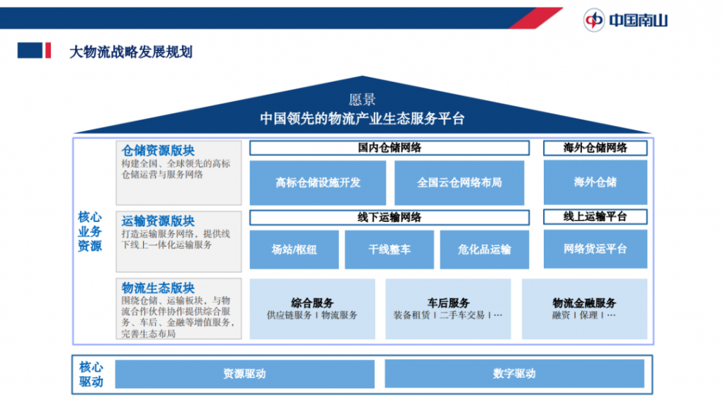 在核心的驅(qū)動能力上,中國南山集團(tuán)已從過往的由資源驅(qū)動(以倉儲資源和運輸資源布局為核心)進(jìn)化為兩輪驅(qū)動(資源驅(qū)動、科技驅(qū)動),通過整合現(xiàn)有大物流板塊資源和科技能力,同物流生態(tài)合作伙伴一起,為客戶提供端到端的一體化供應(yīng)鏈物流服務(wù)。