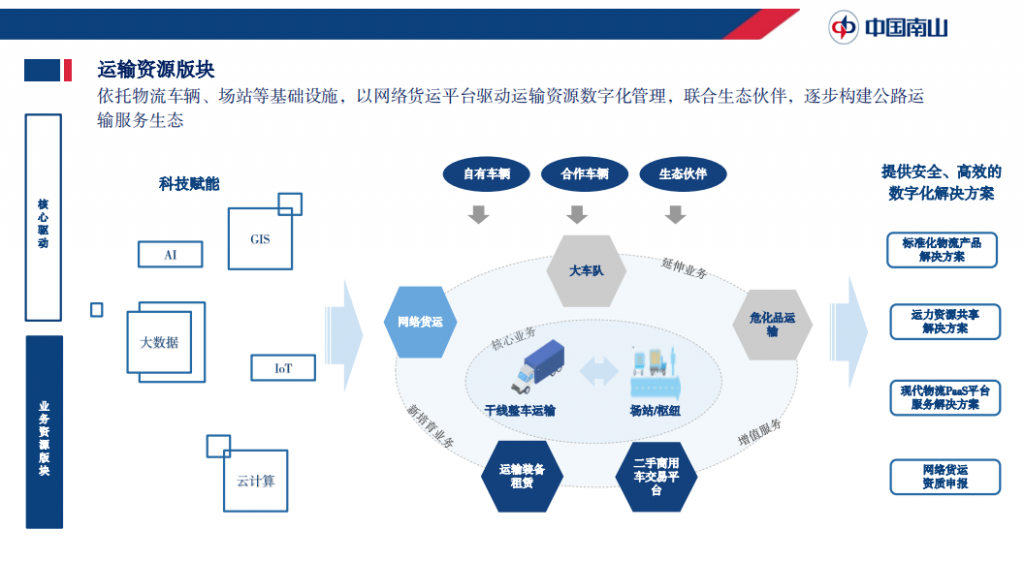 而運輸資源版塊,則依托物流園區(qū)、場站等基礎(chǔ)設(shè)施,以網(wǎng)絡(luò)貨運平臺驅(qū)動運輸資源數(shù)字化管理,逐步構(gòu)建公路運輸服務(wù)生態(tài)。