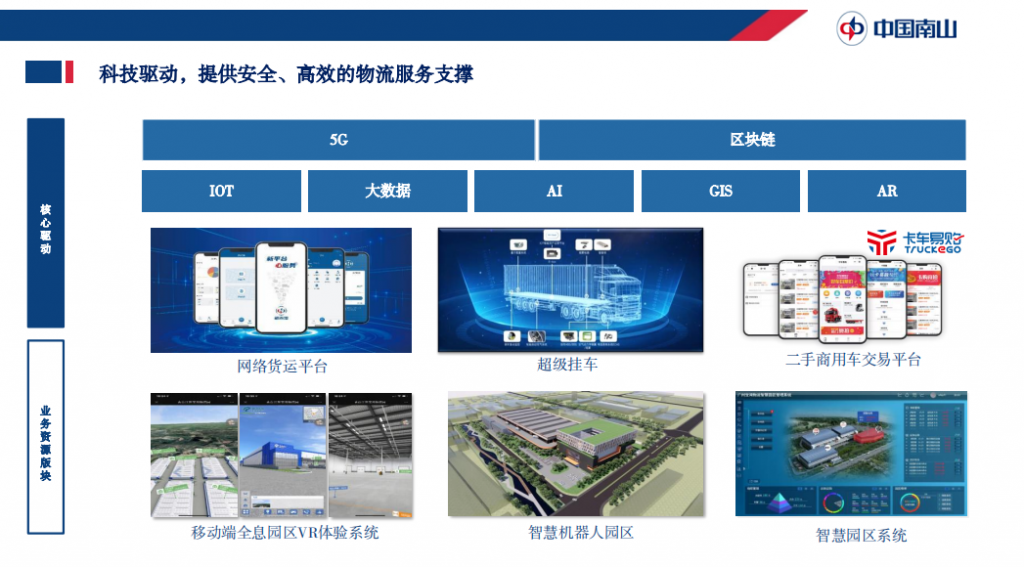 運輸資源版塊現(xiàn)有包括網(wǎng)絡(luò)貨運、干線整車運輸、場站園區(qū)、?;愤\輸、二手商用車交易平臺、運輸裝備租賃等業(yè)務(wù)板塊。目前擁有8,000余臺自有車輛,6萬余臺長期合作車輛,運輸線路超過1,000條,是全國規(guī)模最大的自營車隊。該板塊的核心企業(yè)“赤灣東方”更是被評為中國5A級物流企業(yè)和全國五星級大車隊,是國家多式聯(lián)運示范工程項目牽頭企業(yè),是中國最大的公路甩掛運輸企業(yè)。 物流是技術(shù)應(yīng)用最佳場景,技術(shù)是物流行業(yè)進(jìn)步的重要驅(qū)動。除在布局倉庫、運輸?shù)然A(chǔ)設(shè)施外,中國南山集團(tuán)通過科技驅(qū)動,大力發(fā)展包括網(wǎng)絡(luò)貨運平臺、超級掛車、移動端全息園區(qū)VR體驗系統(tǒng)、智慧機器人園區(qū)等應(yīng)用為行業(yè)提供提供安全、高效的物流服務(wù)。
