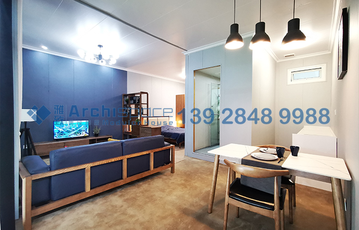 展品由3*8米和3*6米兩個箱體組合而成,房屋建筑面積42平米,戶型布局為一房一廳,包括廚房、洗手間,功能齊全。內(nèi)外裝修均在工廠完成,僅用了不到2個小時就完成了展會現(xiàn)場的吊裝工作。