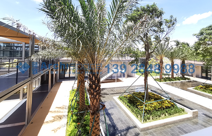 博鰲超級醫(yī)院集中辦公區(qū)項目充分發(fā)揮了打包箱組合靈活的優(yōu)勢,因地制宜,在項目設(shè)計之初充分考慮原有場地的地形地貌條件,最大限度的保留原有熱帶特色植被和苗木,將辦公建筑與周圍環(huán)境融為一體,完美契合綠色、環(huán)保、集約的建設(shè)海南自貿(mào)港的發(fā)展理念。