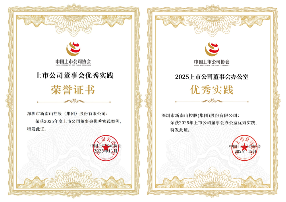 2025.12近日,中國上市公司協(xié)會發(fā)布2025上市公司董事會最佳實踐案例和2025上市公司董事會辦公室最佳實踐的公司榜單,南山控股憑借規(guī)范高效的董事會運作、科學(xué)完善的公司治理體系以及嚴(yán)謹(jǐn)透明的信披投關(guān)工作,榮獲“2025年度上市公司董事會優(yōu)秀實踐案例”及“2025年度上市公司董事會辦公室優(yōu)秀實踐”兩項榮譽。至此,公司已連續(xù)三年入選該系列榜單。