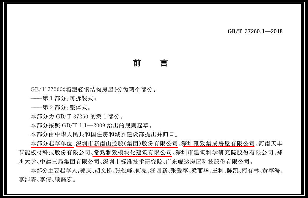 此次打包箱產(chǎn)品的國(guó)家標(biāo)準(zhǔn)正式發(fā)布,雅致作為本國(guó)標(biāo)的主編單位,是公司在集成房屋行業(yè)龍頭地位和綜合實(shí)力的充分展現(xiàn),雅致一直致力于國(guó)家預(yù)制裝配式建筑產(chǎn)業(yè)的標(biāo)準(zhǔn)化、規(guī)范化,引領(lǐng)行業(yè)健康、快速的發(fā)展。