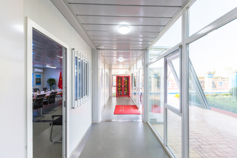 中建三局的辦公樓為雙層、藍色玻璃幕墻形式,以U形半圍合出庭院。項目辦公營地采用了雅致74個打包箱以及一套鋼結(jié)構(gòu)會議室、鋼結(jié)構(gòu)樓梯,正立面采用斷橋鋁型材。雅致的產(chǎn)品就這樣默默陪伴著建設(shè)者們一起度過了這些年的建設(shè)過程,在北方的寒冬和烈日下,為機場建設(shè)者們提供了優(yōu)質(zhì)的辦公場所和食宿營地,助力他們?yōu)闄C場建設(shè)奮戰(zhàn)在一線。