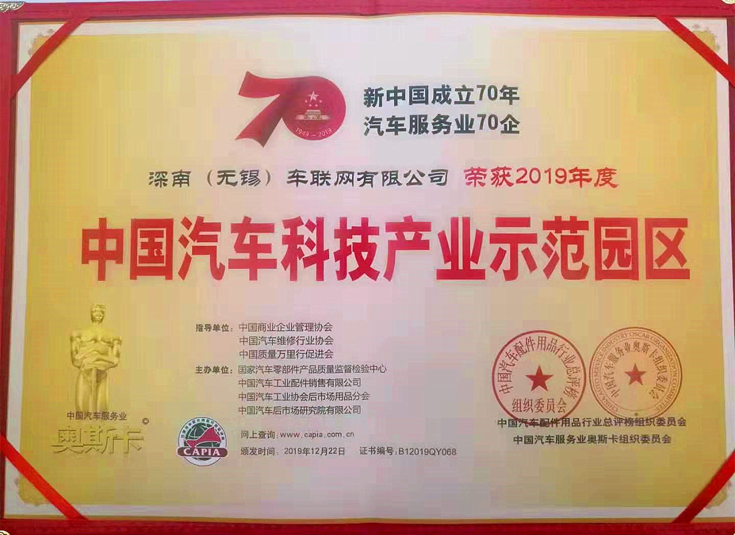 2019.122019年12月,在由中國(guó)汽車配件用品行業(yè)總評(píng)榜組織委員會(huì)、中國(guó)汽車服務(wù)業(yè)奧斯卡組織委員會(huì)主辦的“新中國(guó)成立70年 汽車服務(wù)業(yè)70企”評(píng)選中,深南(無(wú)錫)車聯(lián)網(wǎng)有限公司榮獲2019年度中國(guó)汽車科技產(chǎn)業(yè)示范園區(qū)。
